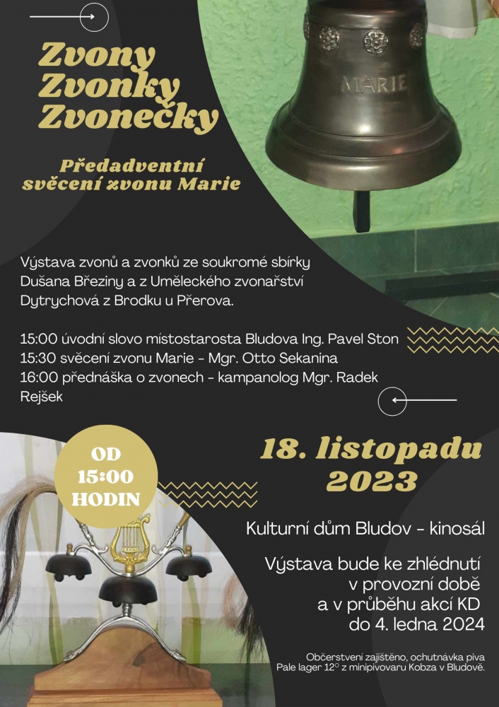 Výstavou Zvony, zvonky, zvonečky, svěcením zvonu a přednáškou letos netradičně zahájí advent. Veřejnost se seznámí nejen se soukromou sbírkou Dušana Březiny i zvonem Marie, který nechal odlít na počest své maminky a který se dočká slavnostního posvěcení, ale bude mít možnost zhlédnout také exponáty z Uměleckého zvonařství Dytrychová z Brodku u Přerova. Slavnostní zahájení se uskuteční 18. listopadu a jeho součástí bude i přednáška kampanologa, redaktora Českého rozhlasu a hudebníka Radka Rejška.