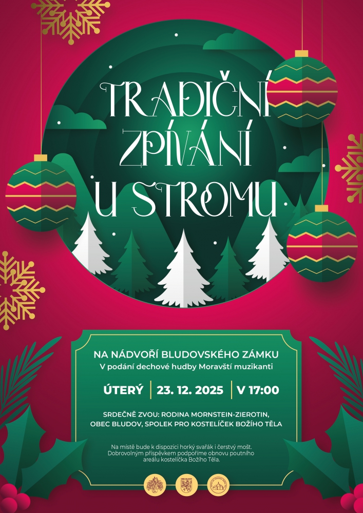 Tradiční zpívání koled a vánočních písní u stromu na nádvoří bludovského zámku s dechovou hudbou Moravští muzikanti. Na místě budou k dispozici nápoje pro zahřátí dospělých i dětí. Dobrovolným příspěvkem podpoříme obnovu poutního areálu kostelíčka Božího Těla. Srdečně zve rodina Mornstein-Zierotin, obec Bludov a Spolek pro Kostelíček Božího Těla.